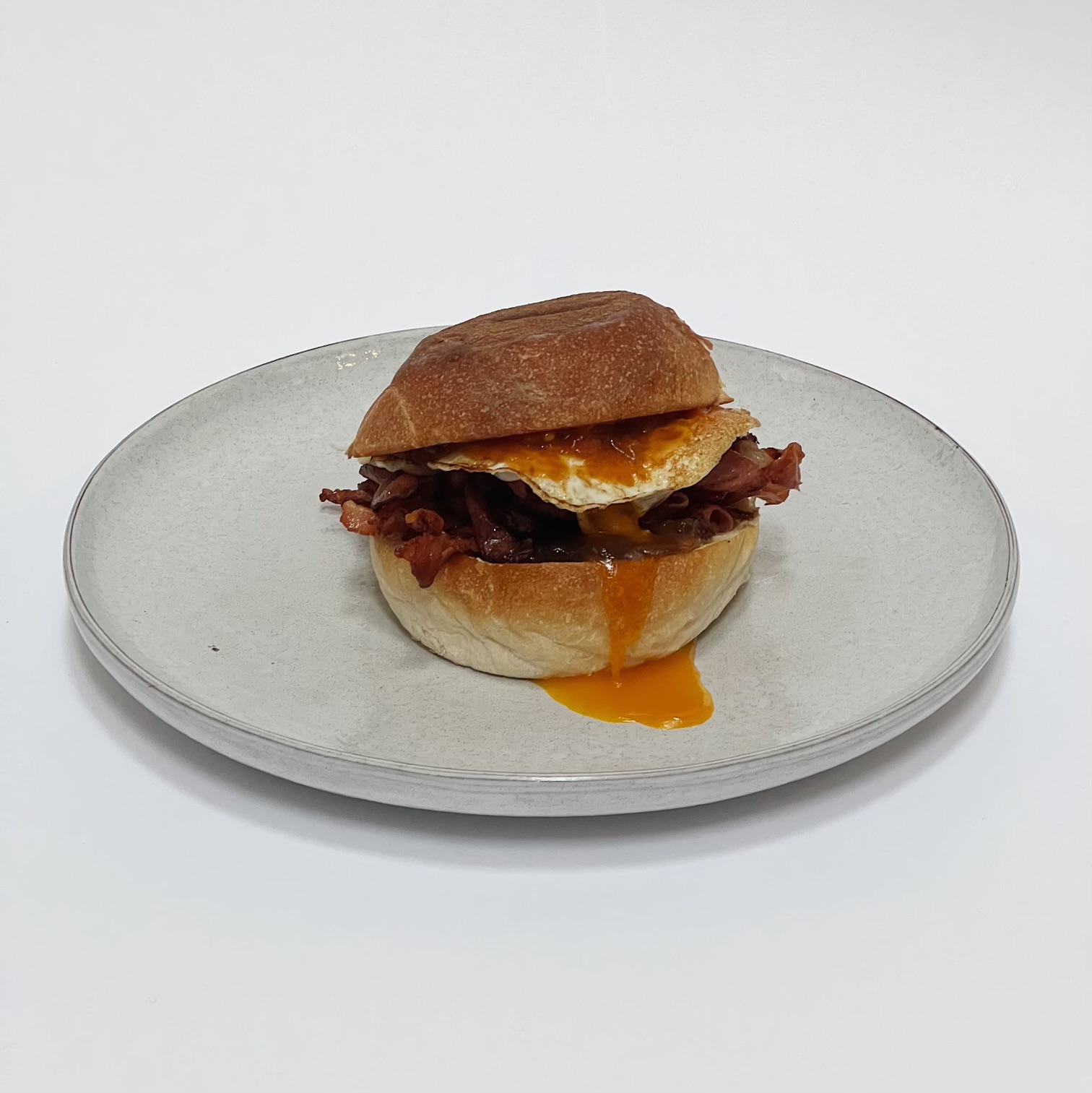 Racine Bakery roll, Trunkey Creek bacon, local egg and relish.